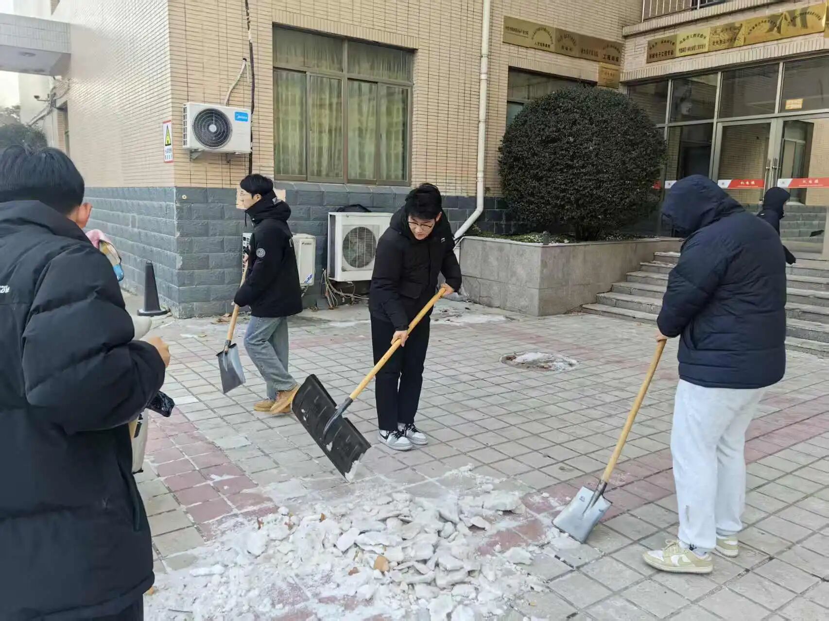 在清扫过程中,学院师生分工明确、配合默契,形成一道道亮丽的风景线。有的负责用铁锹将厚实的积雪铲松,有的拿着扫帚将散雪扫到路边,有的则合力推动推雪板,快速清理大面积的积雪。尽管天气寒冷,大家的脸颊和双手都冻得通红,但每个人的热情却丝毫未减。